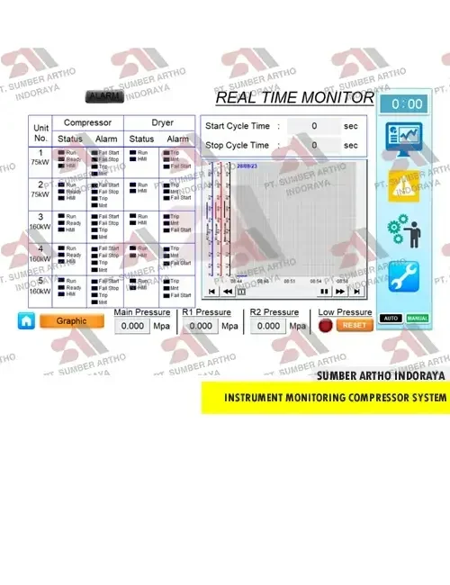 Instrument monitoring dalam sistem kompresor melibatkan penggunaan sensor dan perangkat monitoring untuk mengukur dan mengawasi parameter kritis seperti tekanan udara, suhu, vibrasi, dan konsumsi energi. Informasi yang dikumpulkan oleh sistem ini membantu dalam memantau kinerja kompresor secara real-time, mendiagnosis masalah potensial, dan mencegah kegagalan yang tidak terduga.